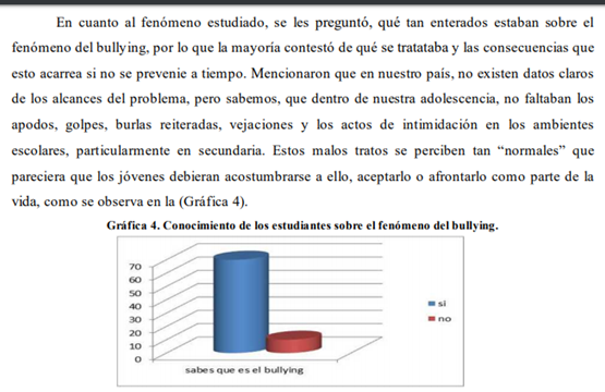 El bullying no ha tenido la suficiente importancia como problema social, es necesario enfocarse en él tal como lo están haciendo otros países. Este es un problema conjunto que no termina con el suicidio de la víctima ni mucho menos con la llegada de la edad adulta. Anteriormente relacionamos los problemas del bullying con la autoestima baja. Ya no podemos volver el tiempo para detectarlo en el momento adecuado y evitar gran cantidad de suicidios, pero aún podemos prevenir y concientizar a la población sobre su importancia. En México, el fenómeno adquiere un matiz alarmante debido a la influencia que ejerce la radio y televisión, además de la pobreza, analfabetismo y falta de empleo; en verdad será difícil contrarrestarlo pero vale la pena intentarlo. Este fue un tema sumamente interesante y que al principio, pareció que no existían suficientes fuentes de información, sin embargo, conforme se avanzó, se pudo constatar que no solo los médicos y psicólogos se interesan por el tema, sino que también abogados y licenciados en general. El bullying es un problema que afecta al ámbito social-psicológico de las personas. Se da por ciertos factores en los individuos quien lo practica, a menudo son por la falta de atención y la confianza en sí mismos. Es un gran problema social ya que afecta la armonía en la que vive o interactúa un determinado grupo de la población. Las formas de prevenirlo es atender el problema directamente con la persona quien lo comete, para determinar los patrones de comportamiento en los que vive y se desarrolla, si no se hace así, seguiremos lamentando más casos que incluso podrían llegar al suicidio.