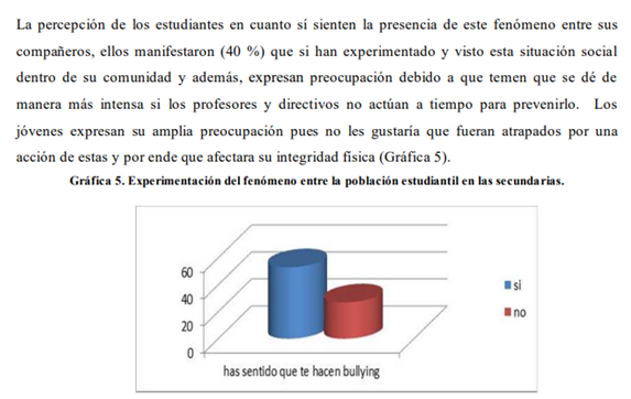 Agregó que uno de los factores que se deben tomar en cuenta es que la percepción de este problema ha cambiado, porque hoy en día es también un fenómeno informativo y social. De acuerdo a estudios de la UNAM y del Politécnico -dijo- México es identificado a nivel internacional como el país con más casos de este tipo de acosos u hostigamientos, y generalmente es a nivel primaria y secundaria en donde se registran con un 60 a 70 por iento de los alumnos que dicen haber sido víctimas de estas situaciones.